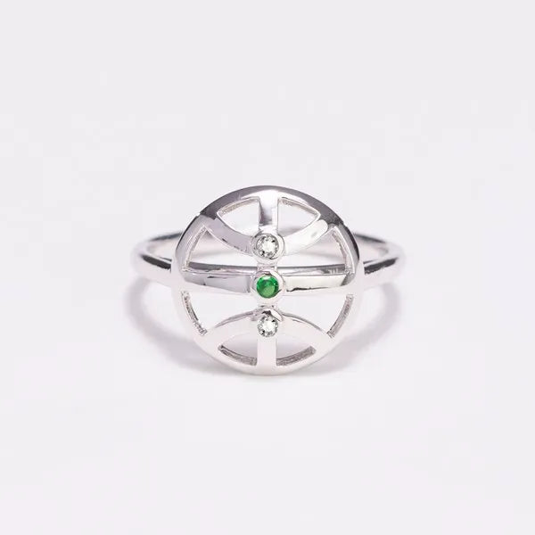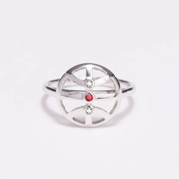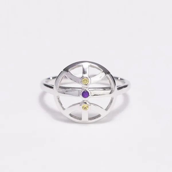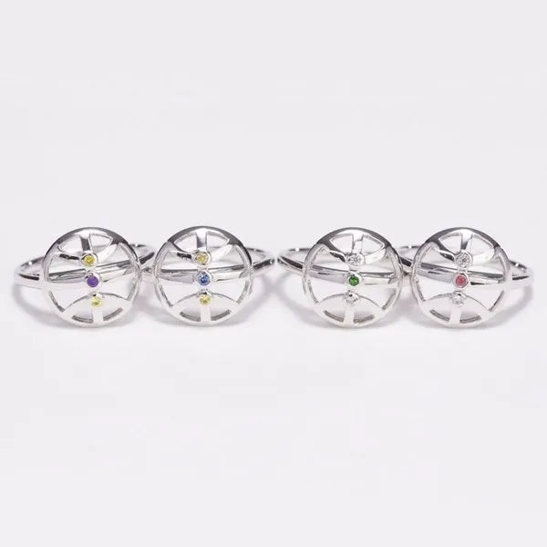 AVID’s Basket-Baller Ring is an openwork and high-polished basketball grooves accented by three bezel-set colored gemstones atop a classic 2mm band. The metal type is rhodium-plated sterling silver.