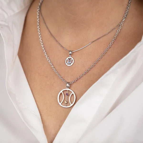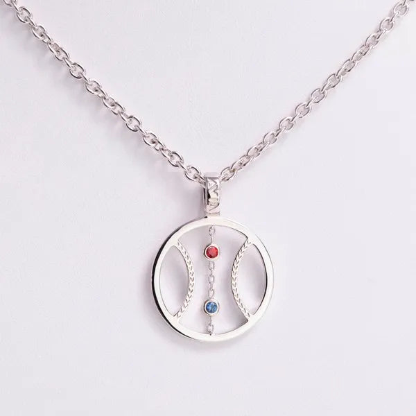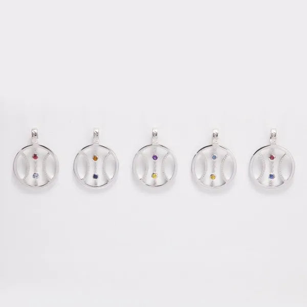 Designed to show the curvature and detail of traditional baseball stitching and seams using open polished outlines and two chain-linked bezel-set colored gemstones. The metal type is rhodium-plated sterling silver.
