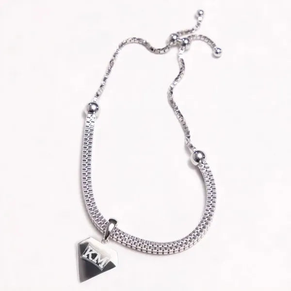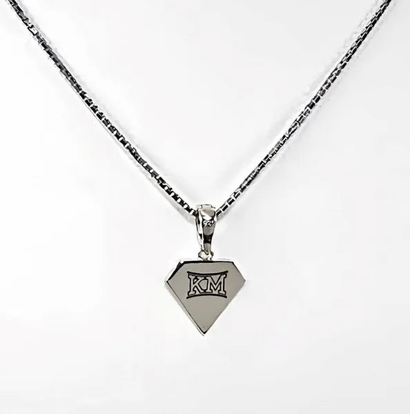 KM logo engraved on the front, AVID logo on the back of this diamond-shaped design featuring AVID’s enhancer bail offering the option to open and securely attach this piece to a chain or bracelet.