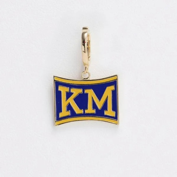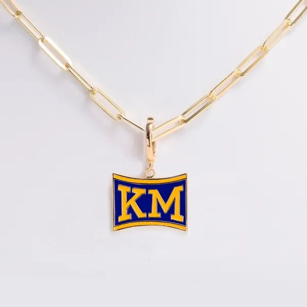 A necklace titled “The Junior” boasting the bold colors of KM yellow and blue enameled in 14kt gold plating. A 4-step enameling process ensures the durability and quality of colors to last from Freshman to Senior year and beyond. An enhancer bail opens and closes to securely fasten to either a chain or a bracelet.