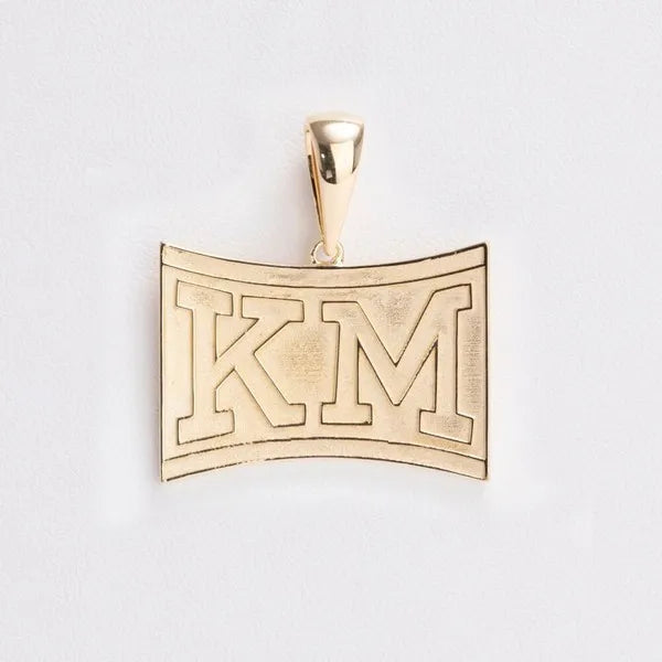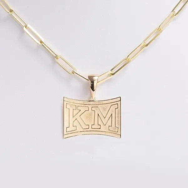Statement piece of the “KM” jewelry line titled “The Senior” in 14kt Gold Plating. The micron plating over a silver base ensures the durability and quality colors to last from Freshman to Senior year and beyond.