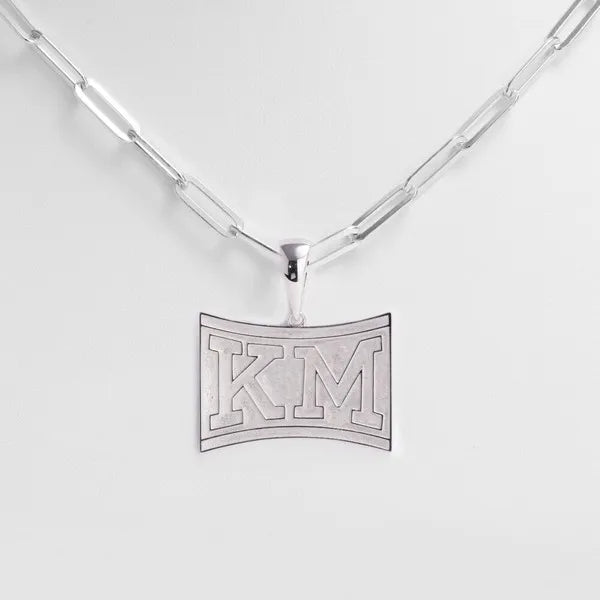 Statement piece of the “KM” jewelry line titled “The Senior” in sterling silver. The rhodium-plating ensures the durability and quality of this piece lasts from Freshman to Senior year and beyond.