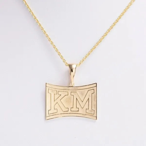 Statement piece of the “KM” jewelry line titled “The Senior” in 14kt Gold Plating. The micron plating over silver base ensures the durability and quality colors to last from Freshman to Senior year and beyond.