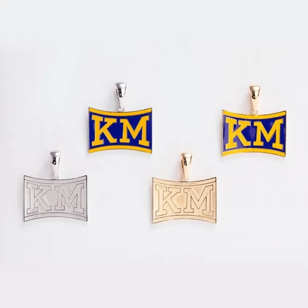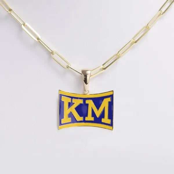 Statement piece of the “KM” jewelry line titled “The Senior” in bold yellow and blue enamel offered in 14kt Gold plating. A 4-step enameling process with micron-plating ensures the durability and quality of colors to last from Freshman to Senior year and beyond.