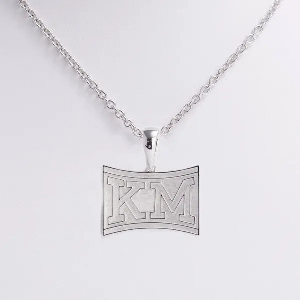 Statement piece of the “KM” jewelry line titled “The Senior” in sterling silver. The rhodium-plating ensures the durability and quality of this piece lasts from Freshman to Senior year and beyond.