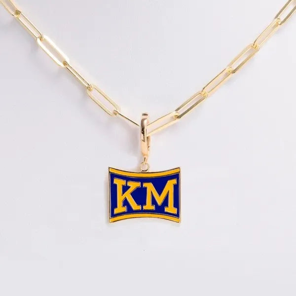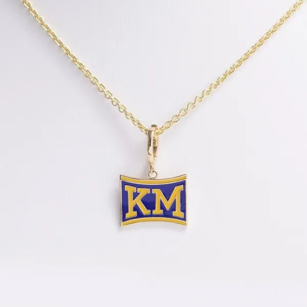 A pendant or charm titled “The Junior” boasting the bold colors of KM yellow and blue enameled in 14kt gold plating. A 4-step enameling process ensures the durability and quality colors to last from Freshman to Senior year and beyond. An enhancer bail opens and closes to securely fasten to either chain or bracelet.