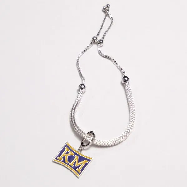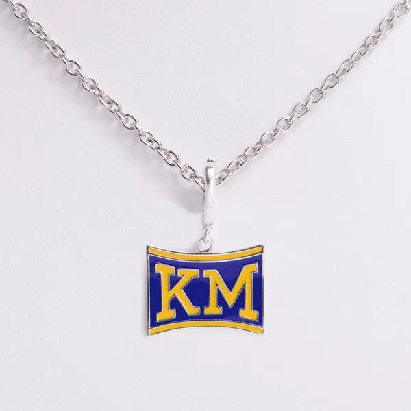 A pendant or charm titled “The Junior” boasting the bold colors of yellow and blue enameled in sterling silver. A 4-step enameling process ensures the durability and quality colors to last from Freshman to Senior year and beyond. An enhancer bail opens and closes to securely fasten to either chain or bracelet.