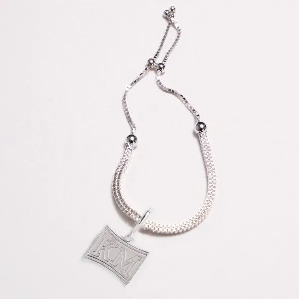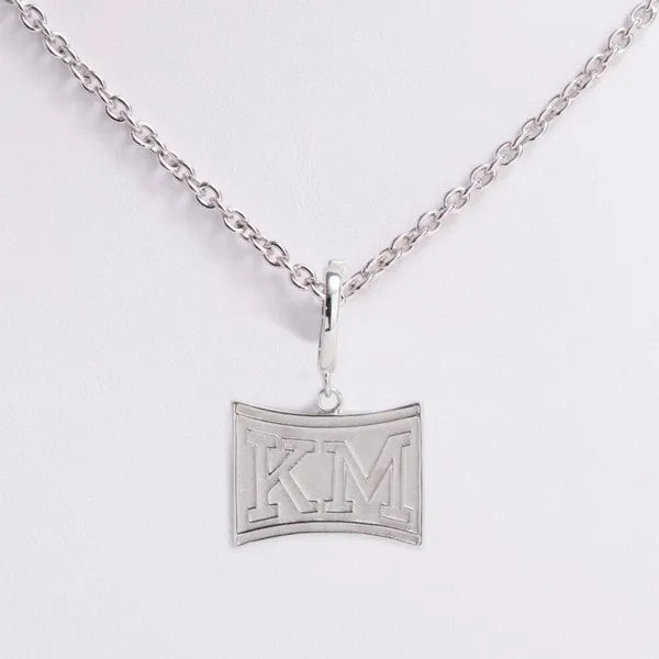 A pendant or charm of the “KM” jewelry line titled “The Junior” with tarnish-resistant (rhodium-plated) sterling silver. This plating ensures the durability and quality of your jewelry lasts from Freshman to Senior year and beyond. An enhancer bail opens and closes, securely fastens to either a chain or bracelet.