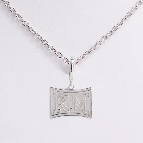 A classic necklace part of the “KM” jewelry line titled “The Junior” in tarnish-resistant (rhodium plated) sterling silver. This plating ensures the durability and quality of your jewelry lasts from Freshman to Senior year and beyond. An enhancer bail opens and closes to securely fasten to either chain or bracelet.
