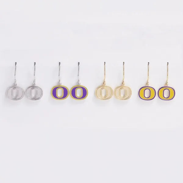 Matching “O” logos flashing the purple and yellow dangling from ball dot French earring hooks. The same 4-step enameling process is used to ensure lasting durability and quality, so the earrings last from Freshman to Senior year and beyond.