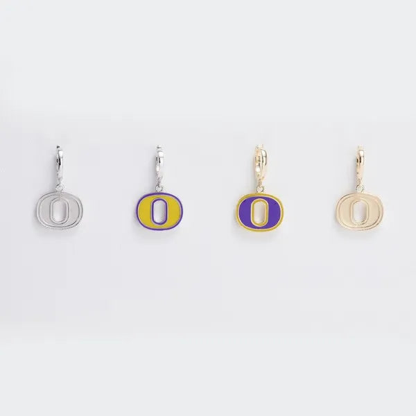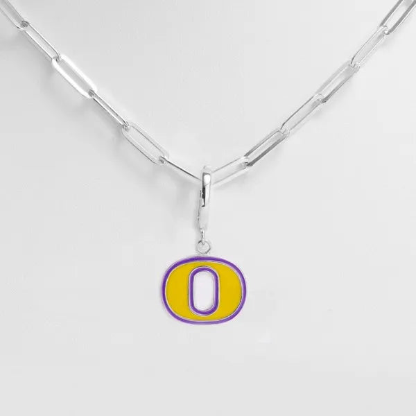 A classic necklace part of the “O” jewelry line titled “The Junior” boasts the same bold colors of purple and yellow in enameled sterling silver. A 4-step enameling process ensures the durability and quality of colors to last from Freshman to Senior year and beyond. The enhancer bail opens and closes so it can attach securely to any chain or bracelet.