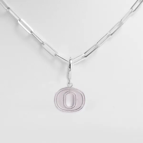 A classic necklace part of the “O” jewelry line titled “The Junior” in tarnish-resistant (rhodium-plated) sterling silver. This plating ensures the durability and quality of your jewelry lasts from Freshman to Senior year and beyond. The enhancer bail opens and closes so it can attach securely to any chain or bracelet.