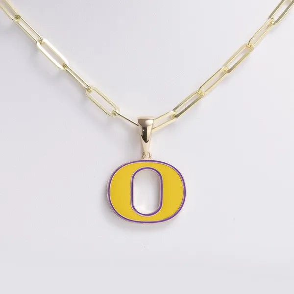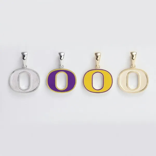 Statement piece of the “O” jewelry line titled “The Senior” in vibrant purple and yellow in the highest quality14kt micron-plating over a sterling silver base. The plating and 4 step enameling process ensures the durability and quality of colors that lasts from Freshman to Senior year and beyond.