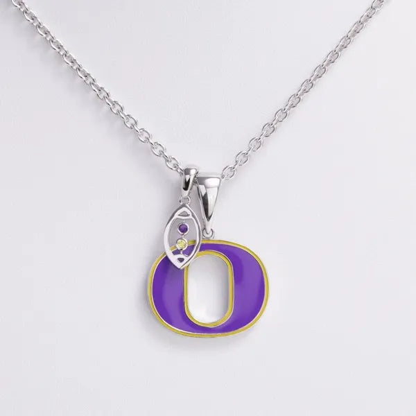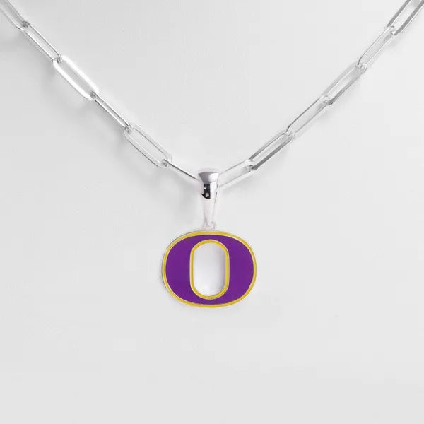 Statement piece of the “O” jewelry line titled “The Senior” in vibrant purple and yellow in tarnish-resistant sterling silver. The 4-step enameling process makes sure the colors stay strong and last from Freshman year to Senior year and beyond.