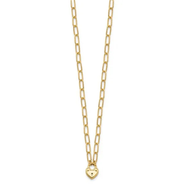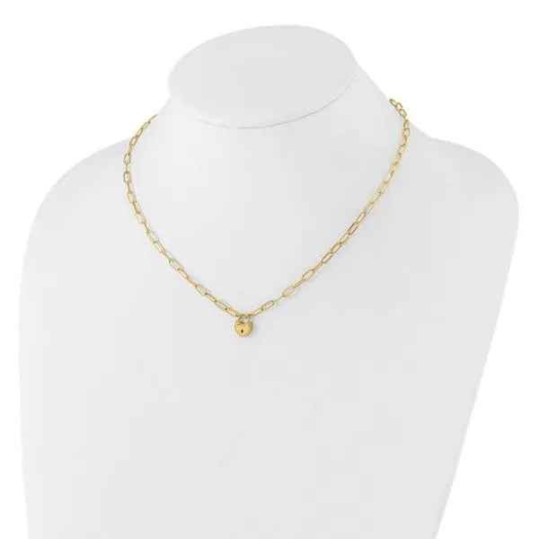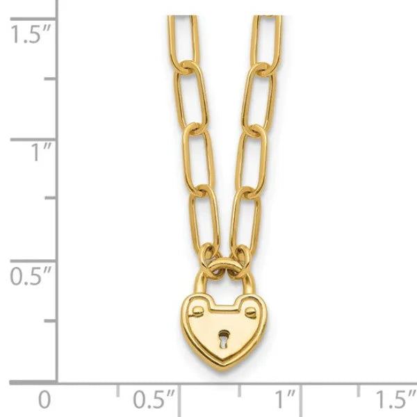 14K Polished Heart Lock Charm Paperclip Link Necklace