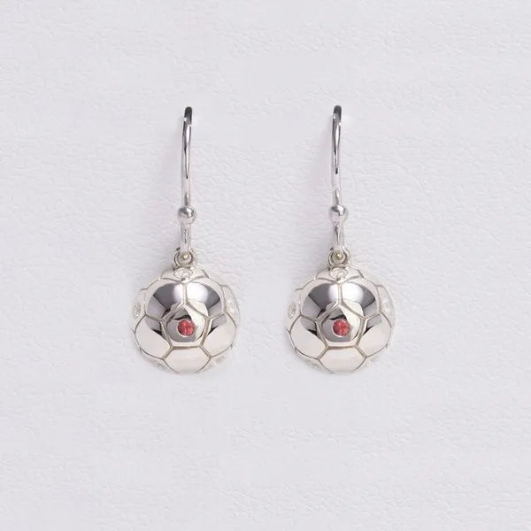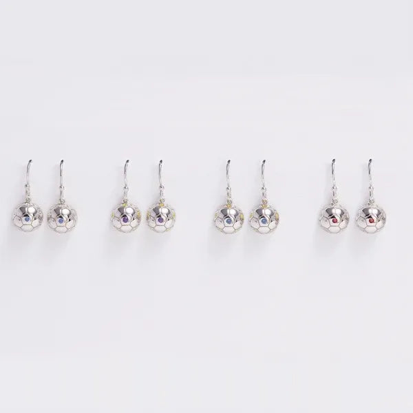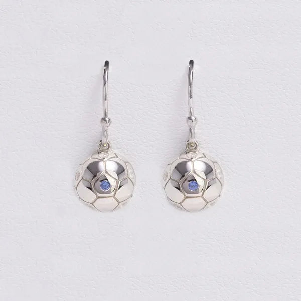 Soccer Ball Dangle Earrings with traditional pentagon and hexagon patterns, twelve flush-set colored gemstones in rhodium-plated sterling silver and French hook earring wires.
