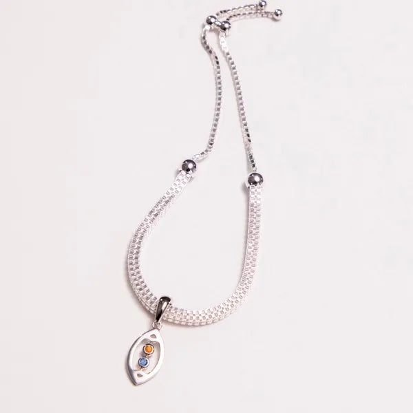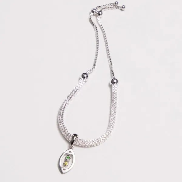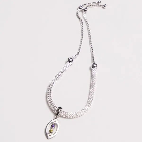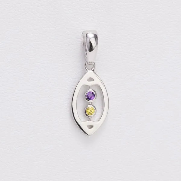 AVID's Open Football bracelet – a high-polished football outline with two bezel-set colored gemstones. The enhancer bail opens and closes so it can attach securely to any chain or bracelet. The metal type is rhodium-plated sterling silver.