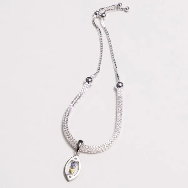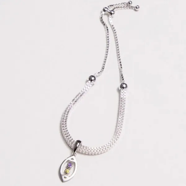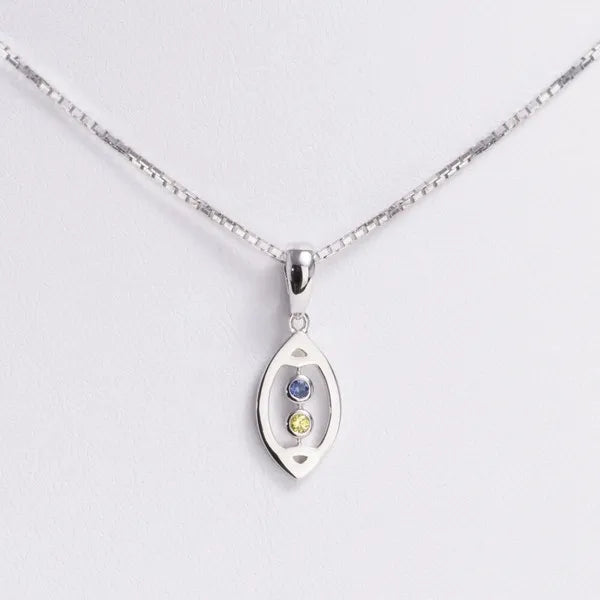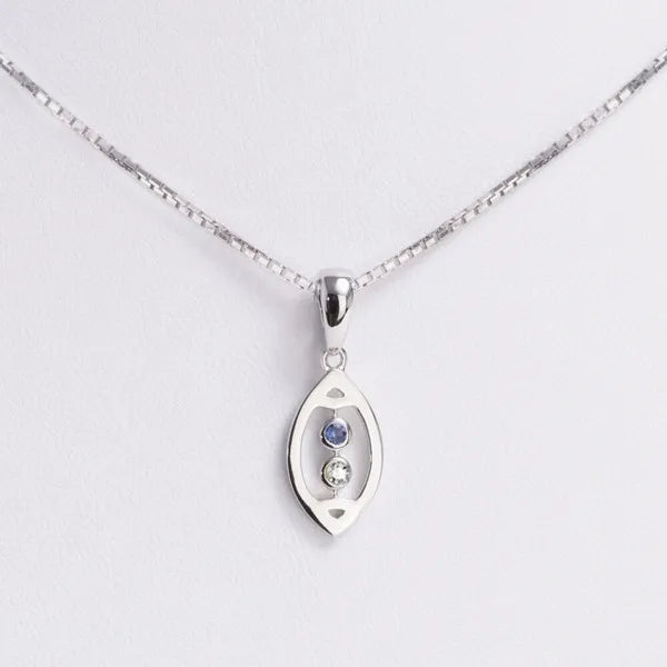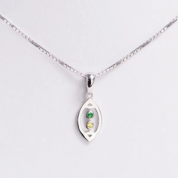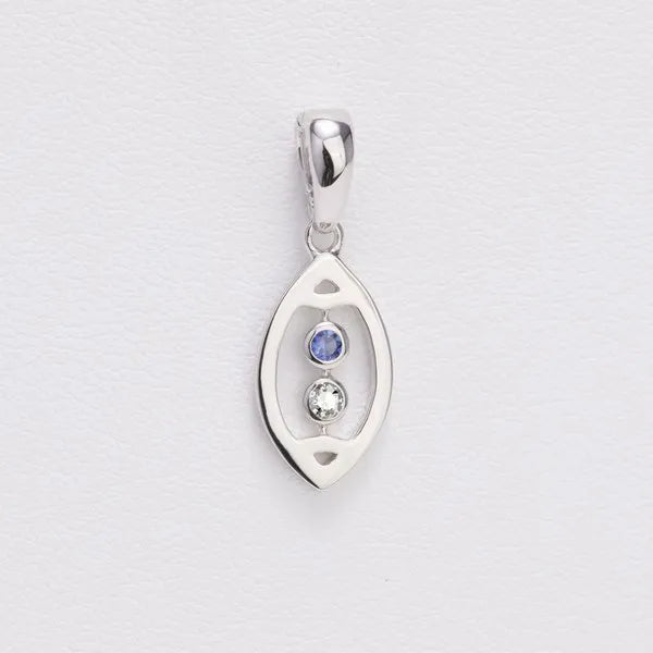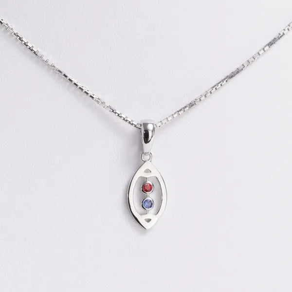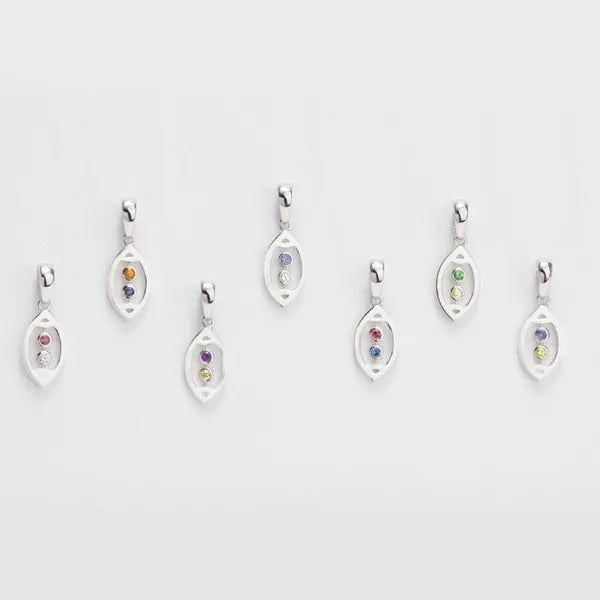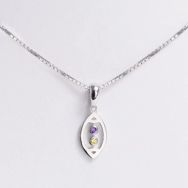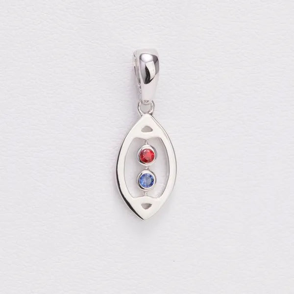 AVID's polished and open football charm/pendant features the outline of a football with laces replaced by two round, chain-linked bezel-set colored gemstones. The metal type is rhodium-plated sterling silver.