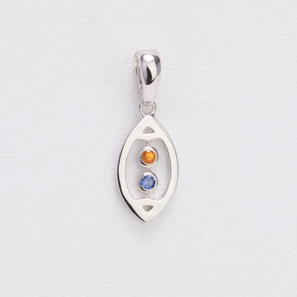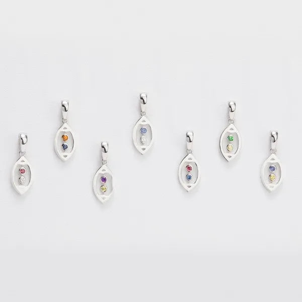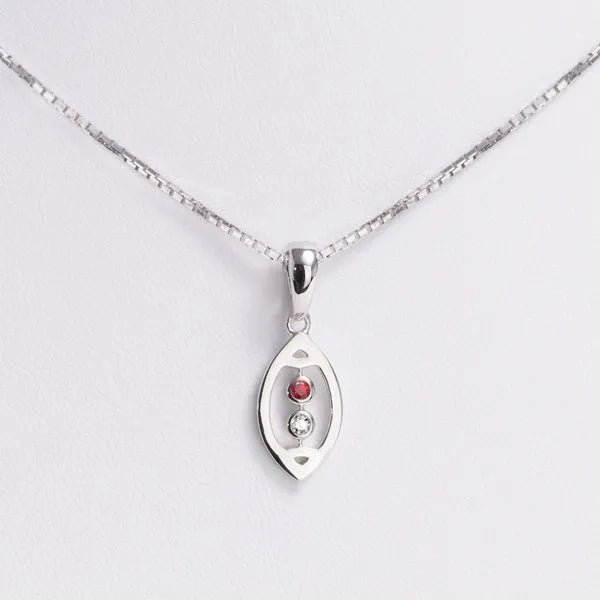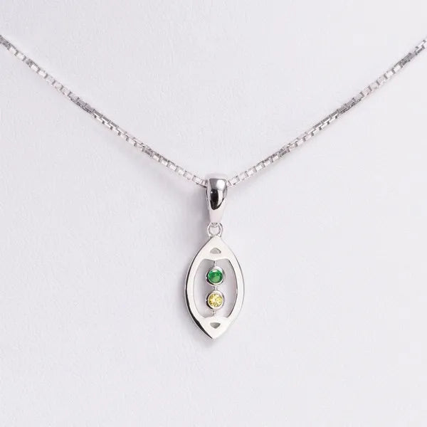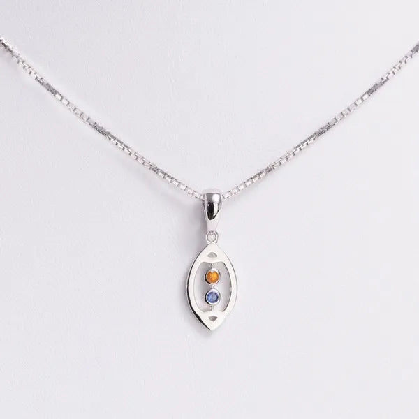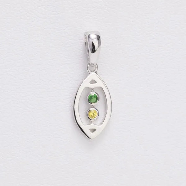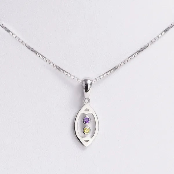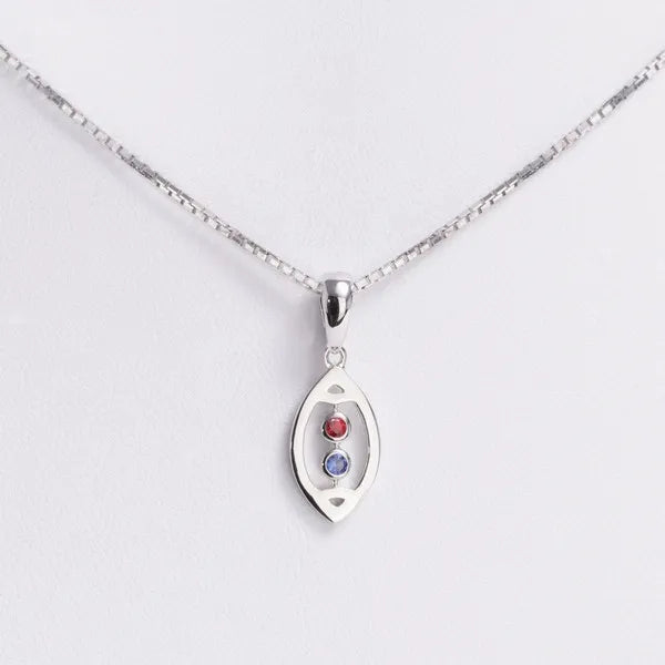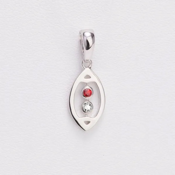 AVID's Open Football II Necklace – a high-polished football outline with two bezel-set colored gemstones. The enhancer bail opens and closes so it can attach securely to any chain or bracelet. The metal type is rhodium-plated sterling silver.