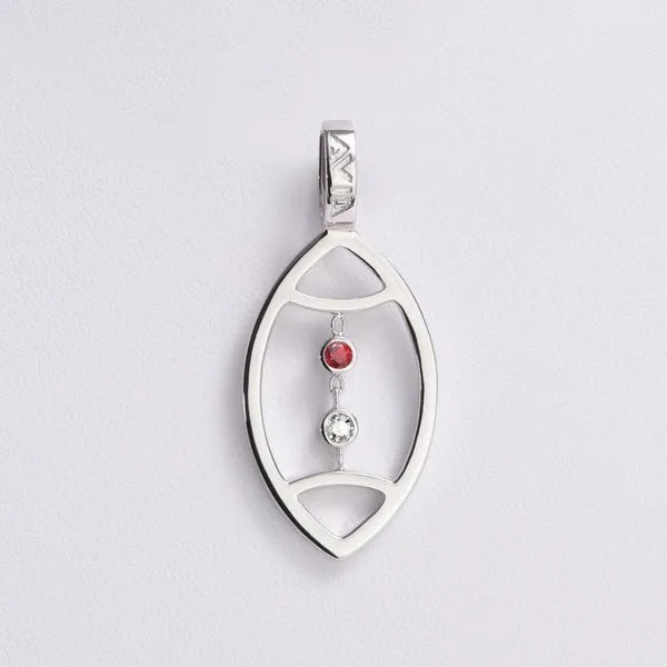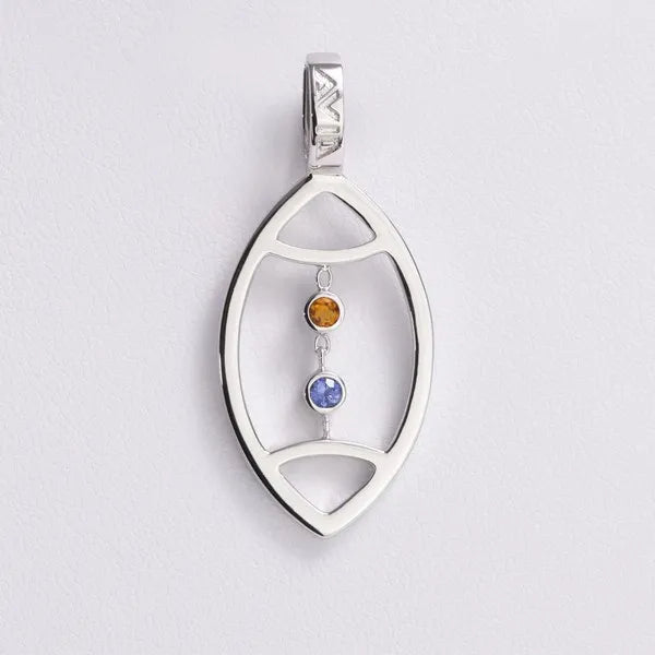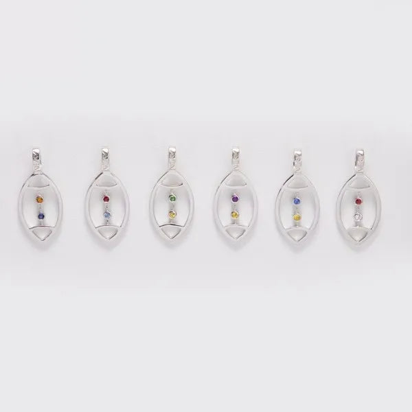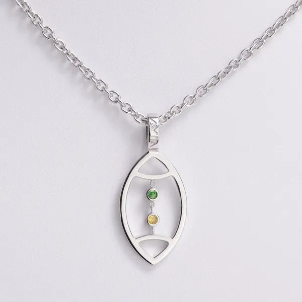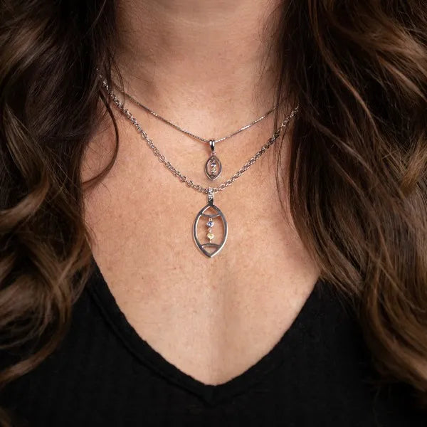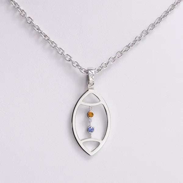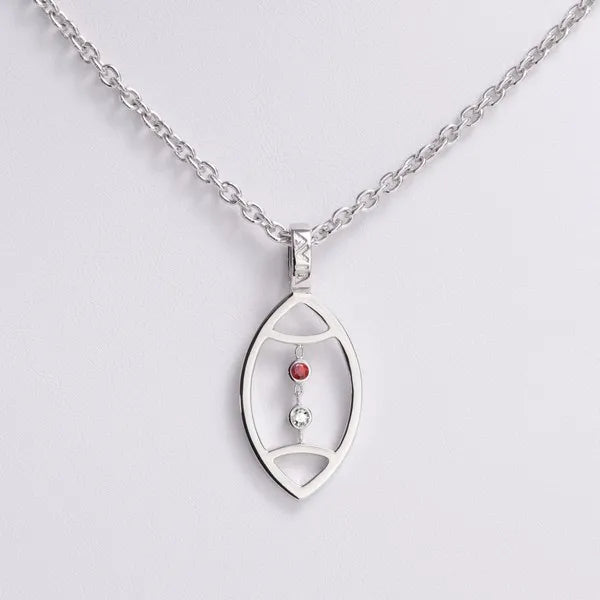 AVID's Open Football Necklace features a high-polished open football outline with the laces replaced by two round, chain-linked bezel-set colored gemstones. The metal type is rhodium-plated sterling silver.