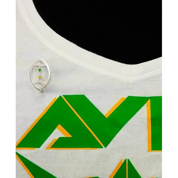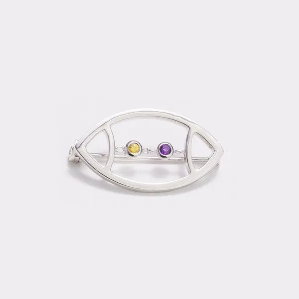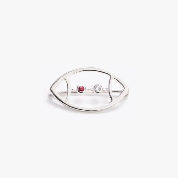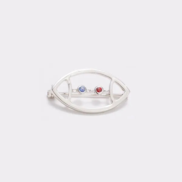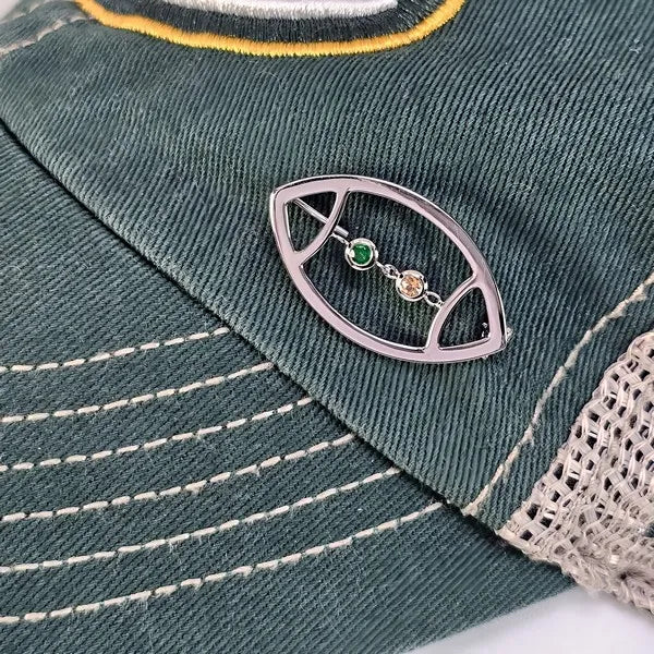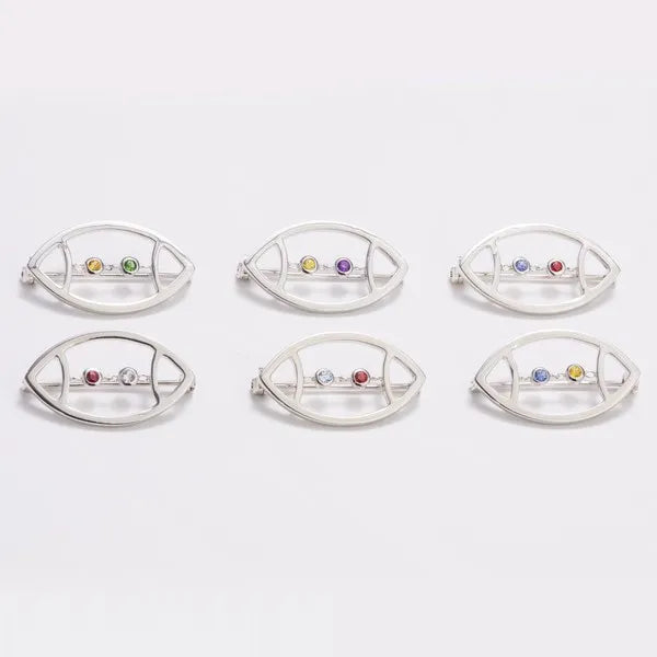 AVID's Football Pin – a polished and open football outline with laces replaced by two round, chain-linked bezel-set colored gemstones with a latch and catch pin. The metal type is rhodium-plated sterling silver.